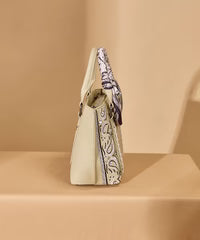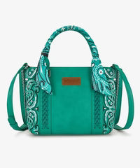 One top handle is uniquely wrapped with a paisley scarf detail, adding a distinctive Western touch and elevated visual appeal. Designed for versatility, this handbag features sturdy top handles and a detachable shoulder strap, allowing it to be carried by hand, worn on the shoulder, or styled as a cross-body bag. Perfect for daily essentials, making it ideal for workdays, casual outings, and Western-inspired outfits.