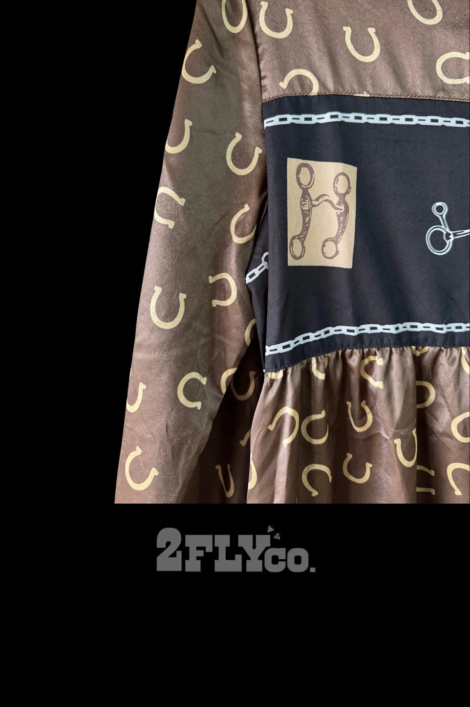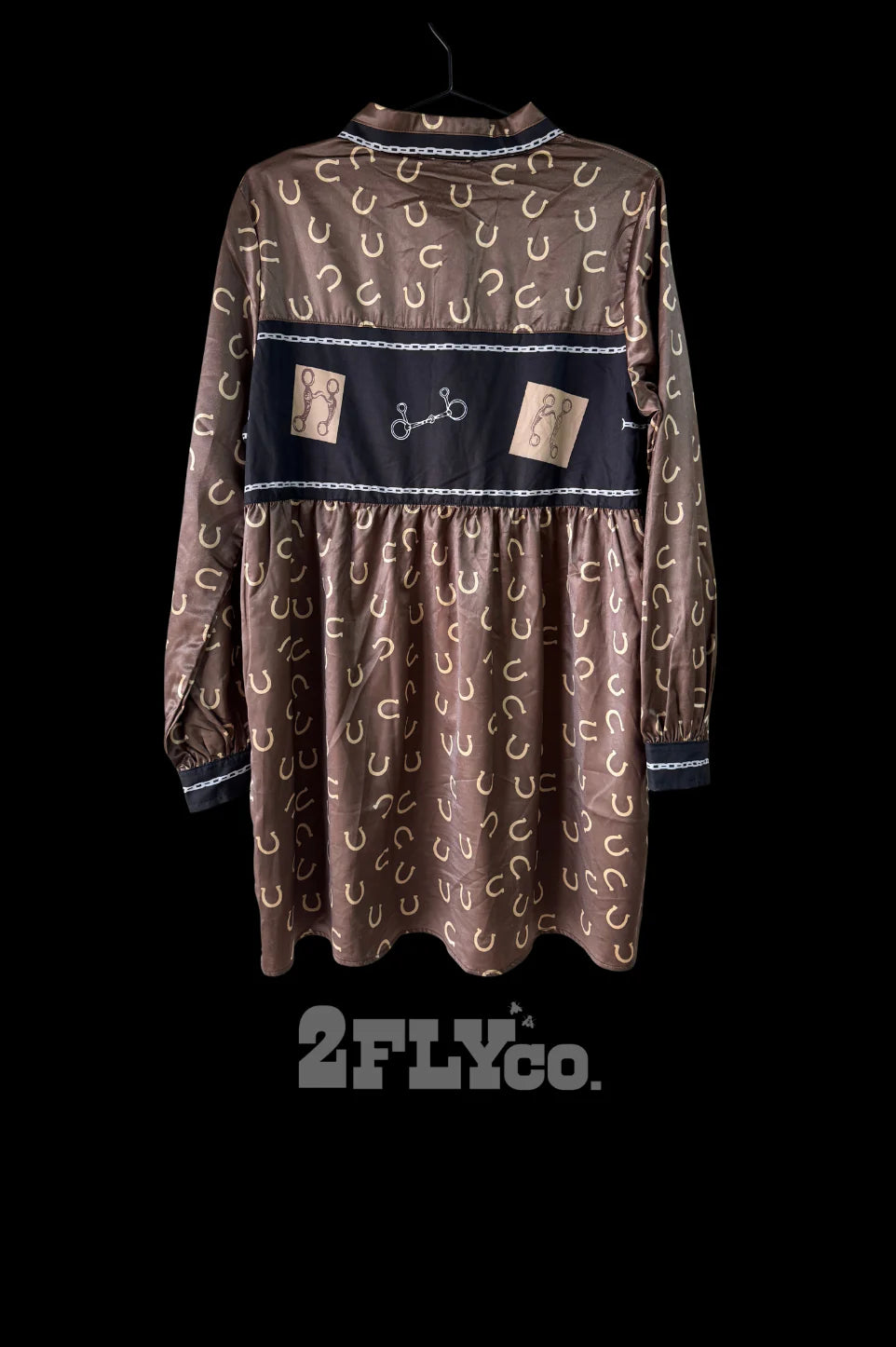 This satin-feel dress features an allover horseshoe print with the prettiest chain details along the collar and cuffs, plus that bold black band with bit graphics that makes it stand out in the best way. It’s one of those pieces that looks like you tried… without actually trying.