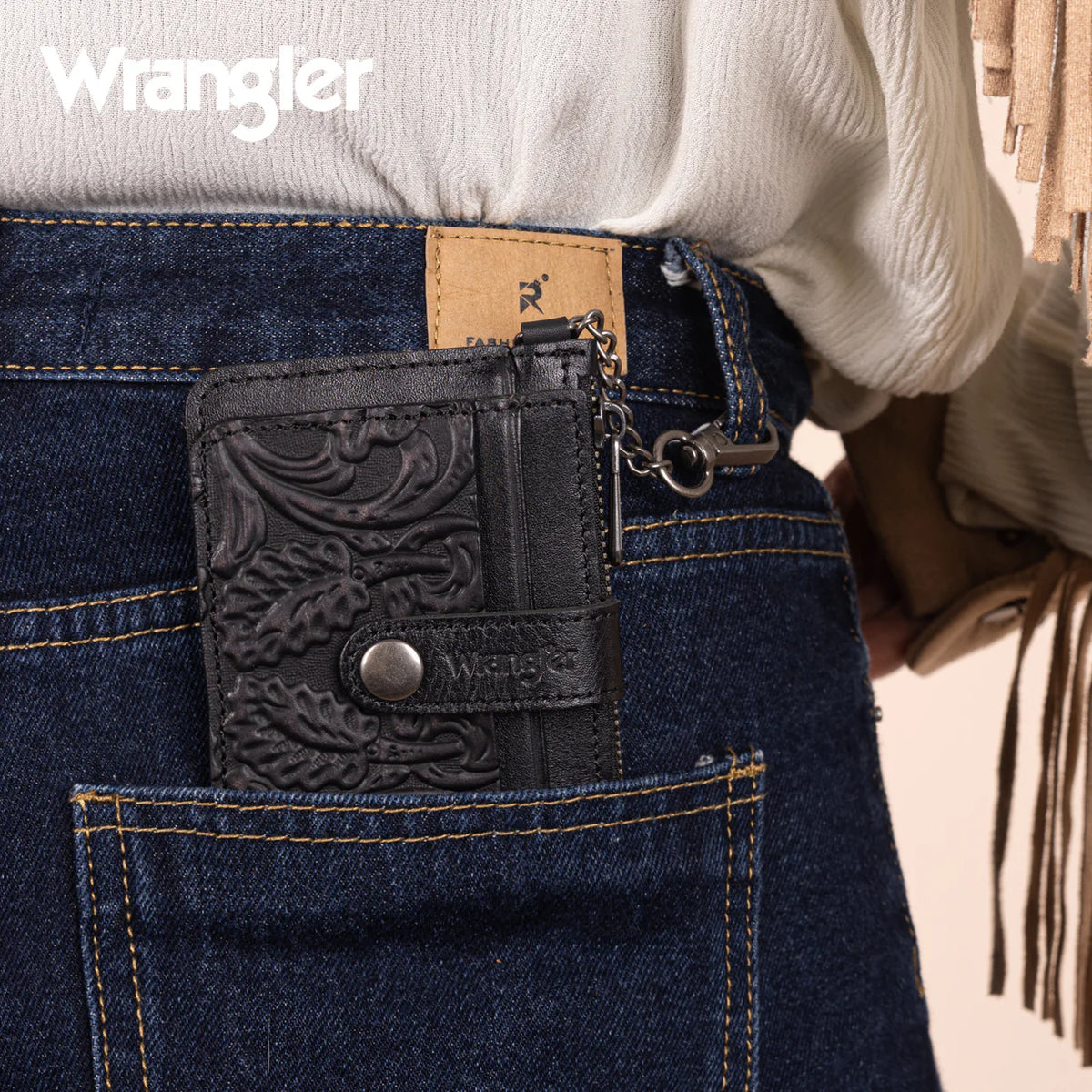 - Wrangler logo embossed on the flap with button closure